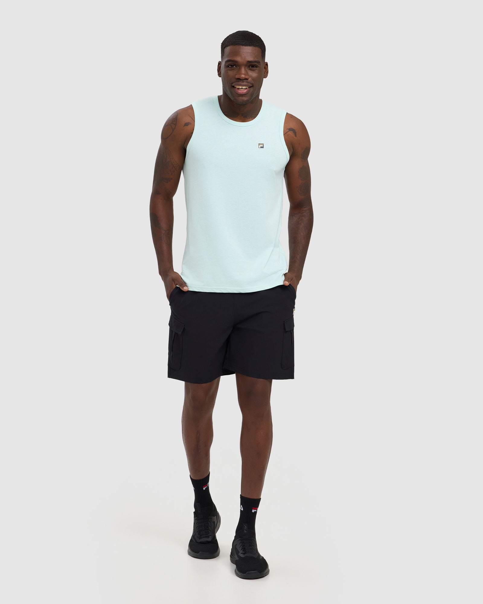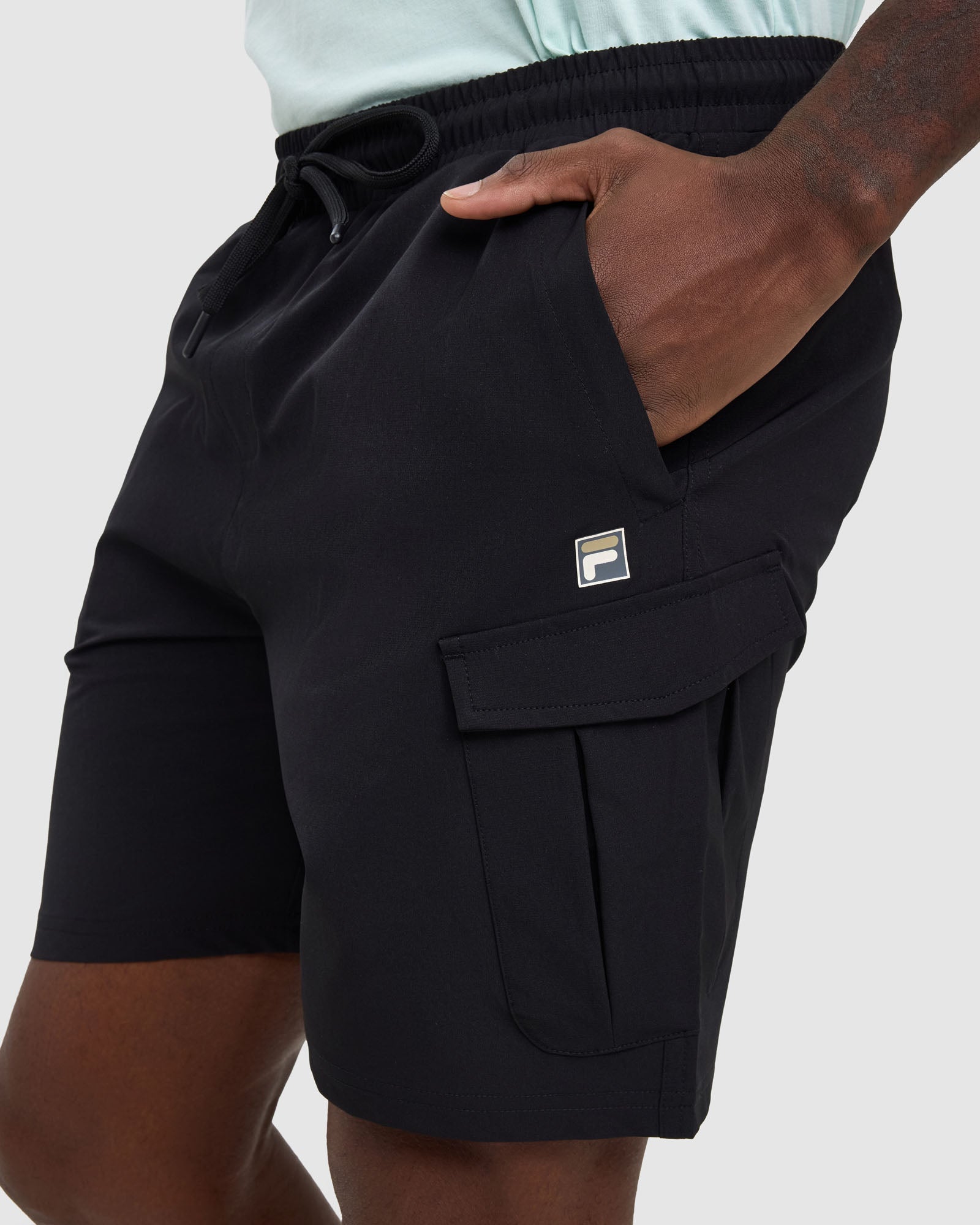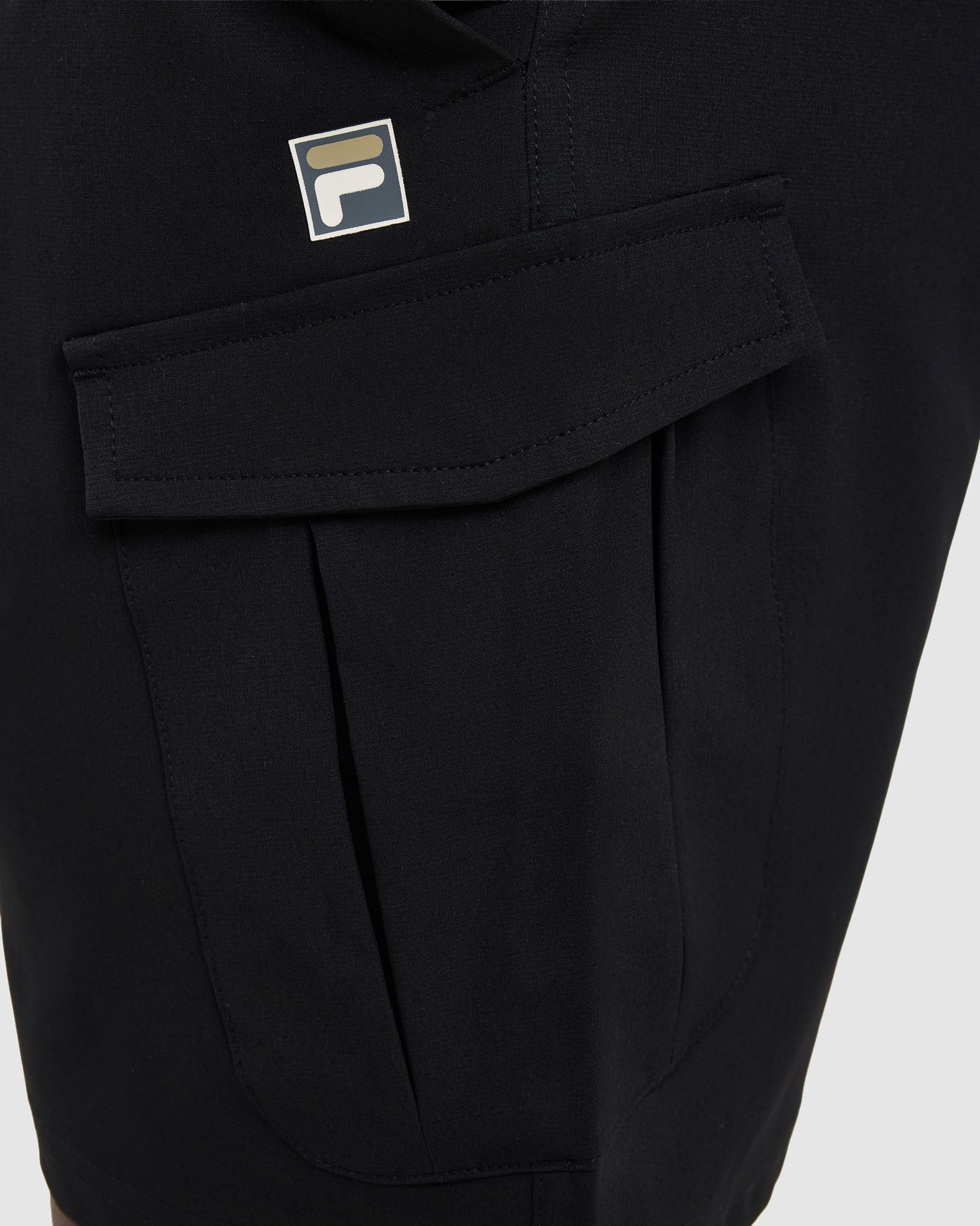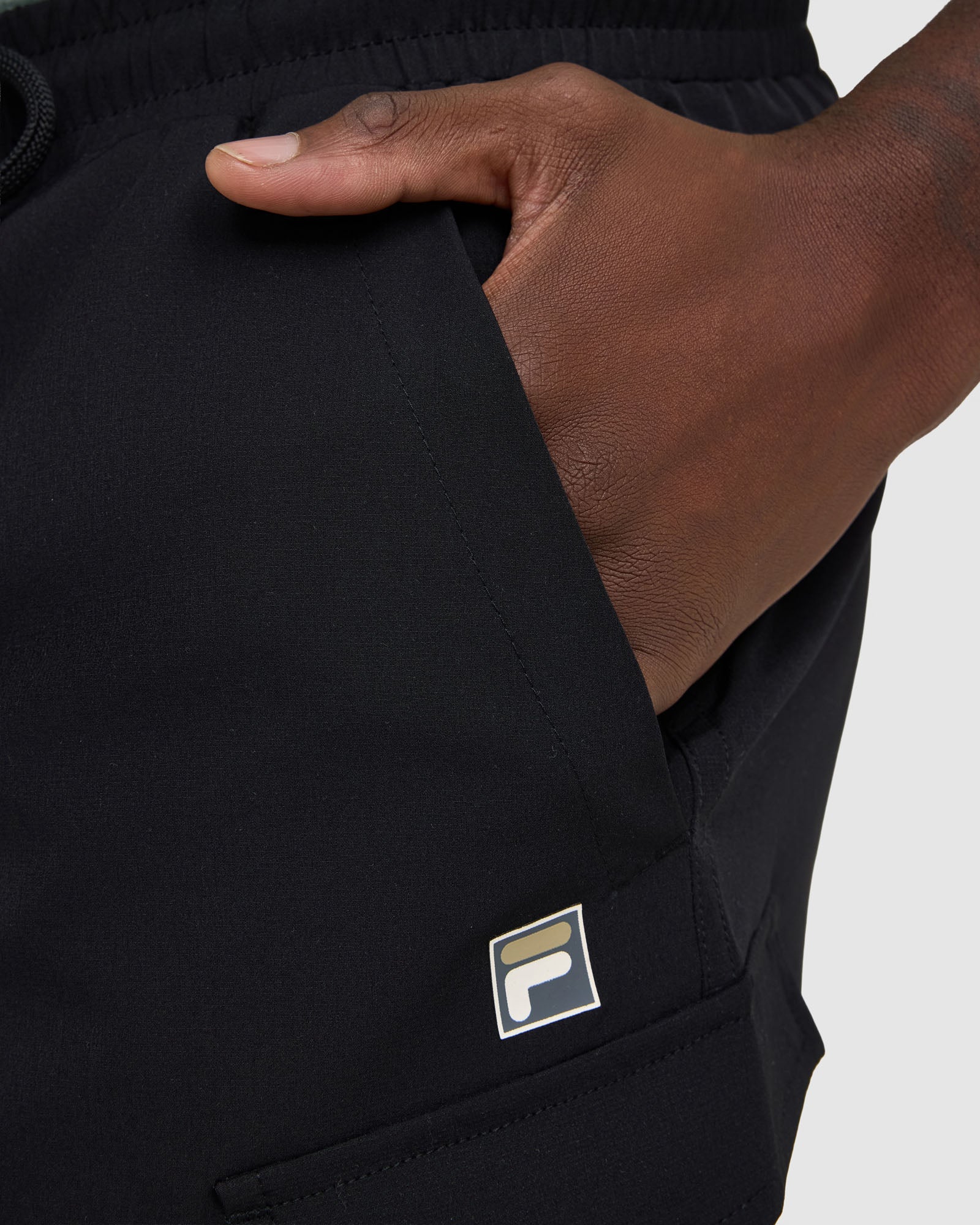 - FILA logo to left side leg