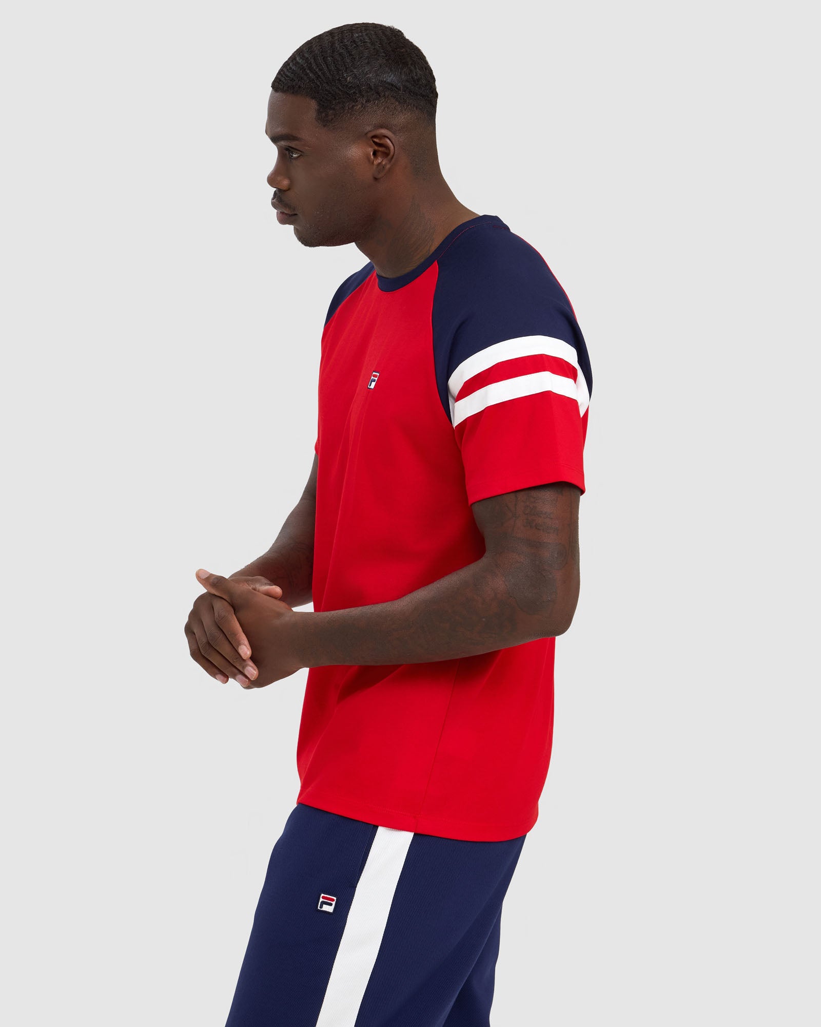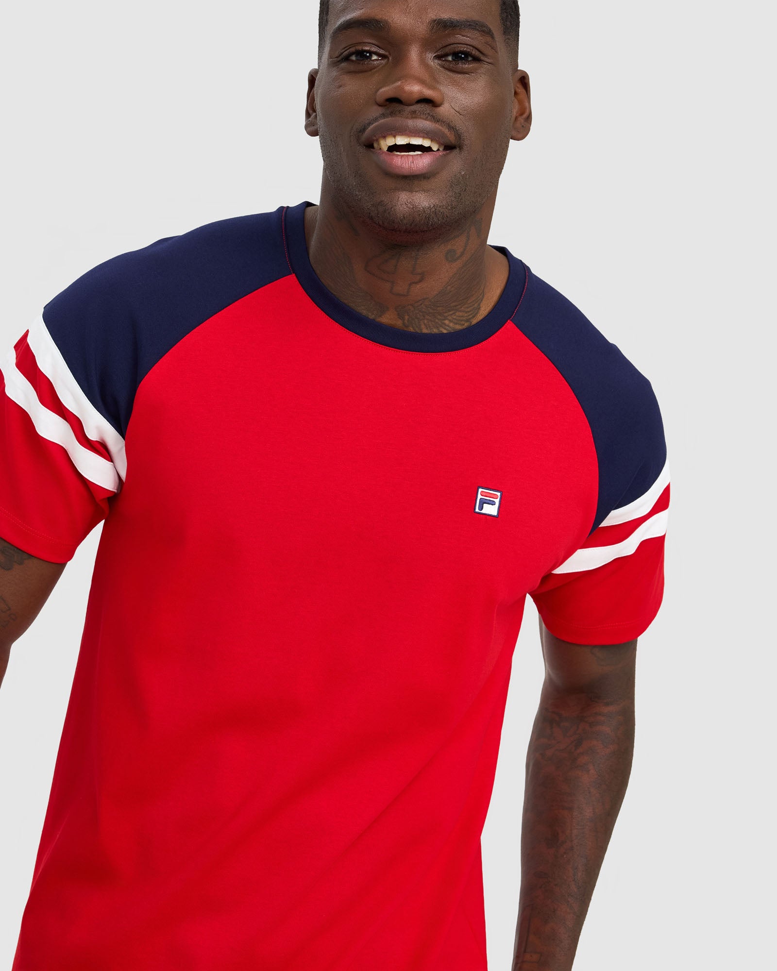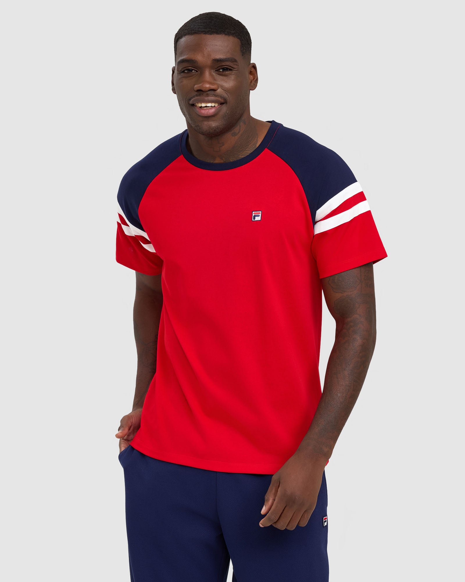 Refresh your everyday lineup with our Men's Olin Tee. Available in 3 classic colours, this slim-fit tee is made from a soft cotton blend fabric for all day comfort. It features a ribbed crew neckline, short sleeves with contrast colour block panels for a bold look, and is finished with an embroidered FILA logo to left chest.