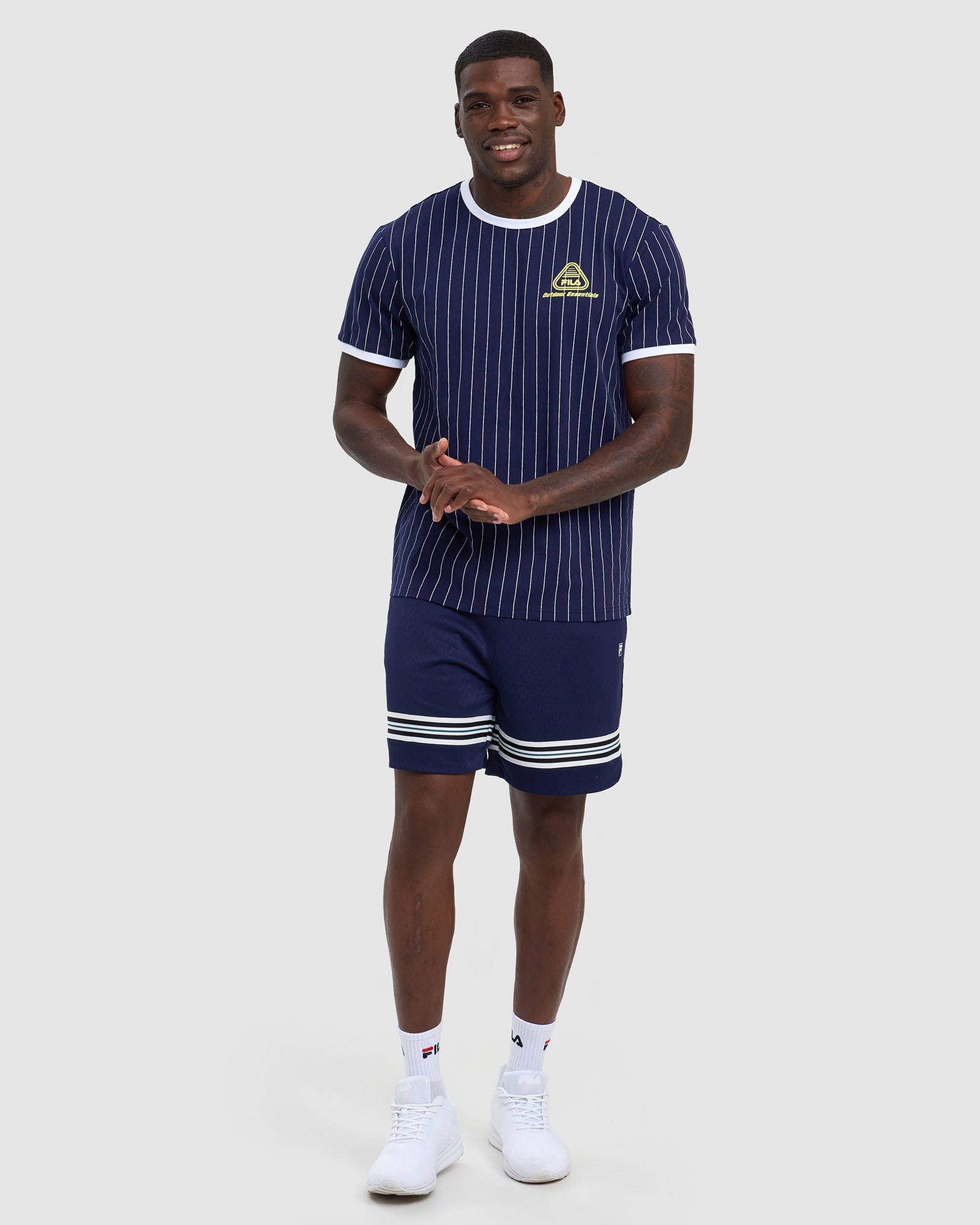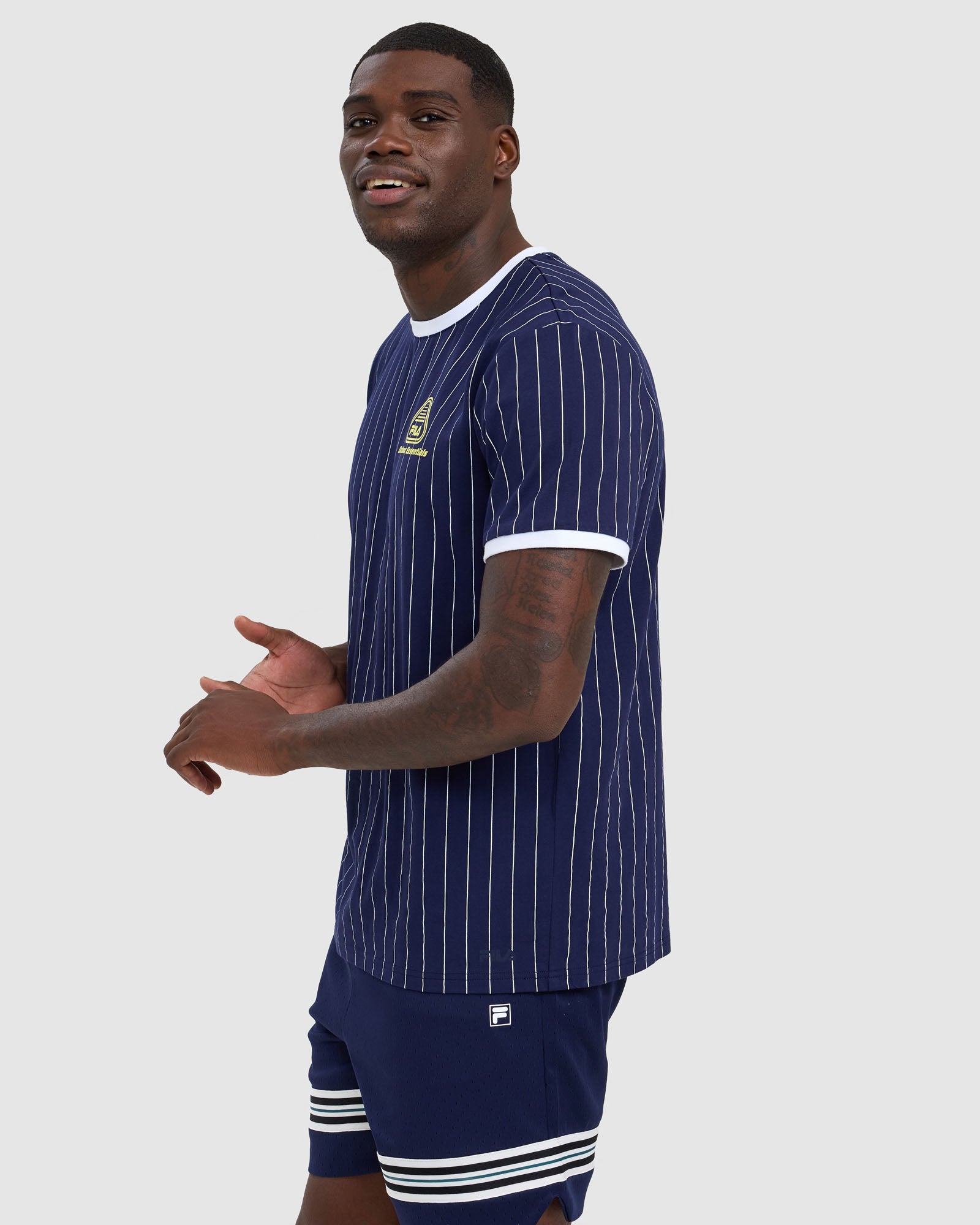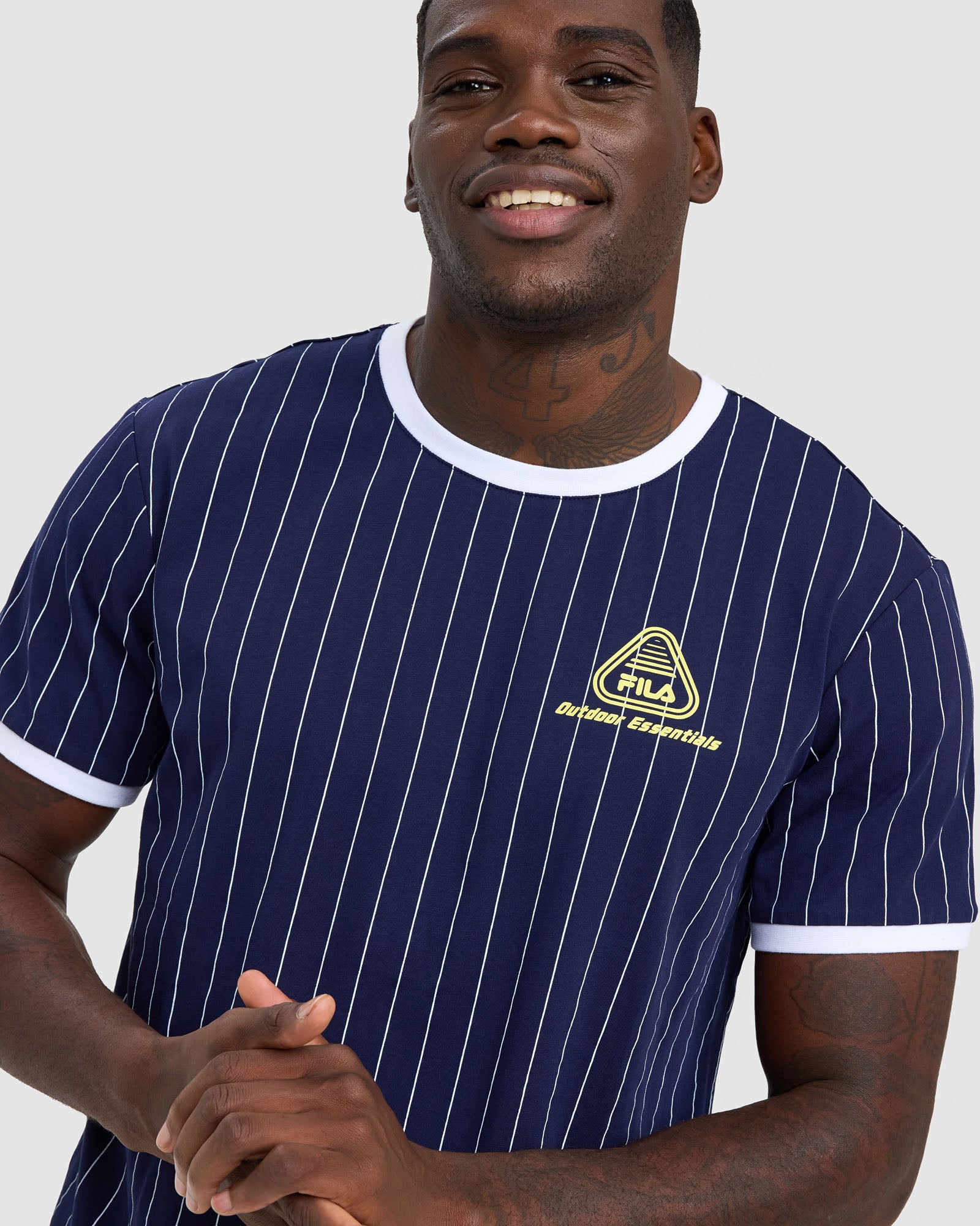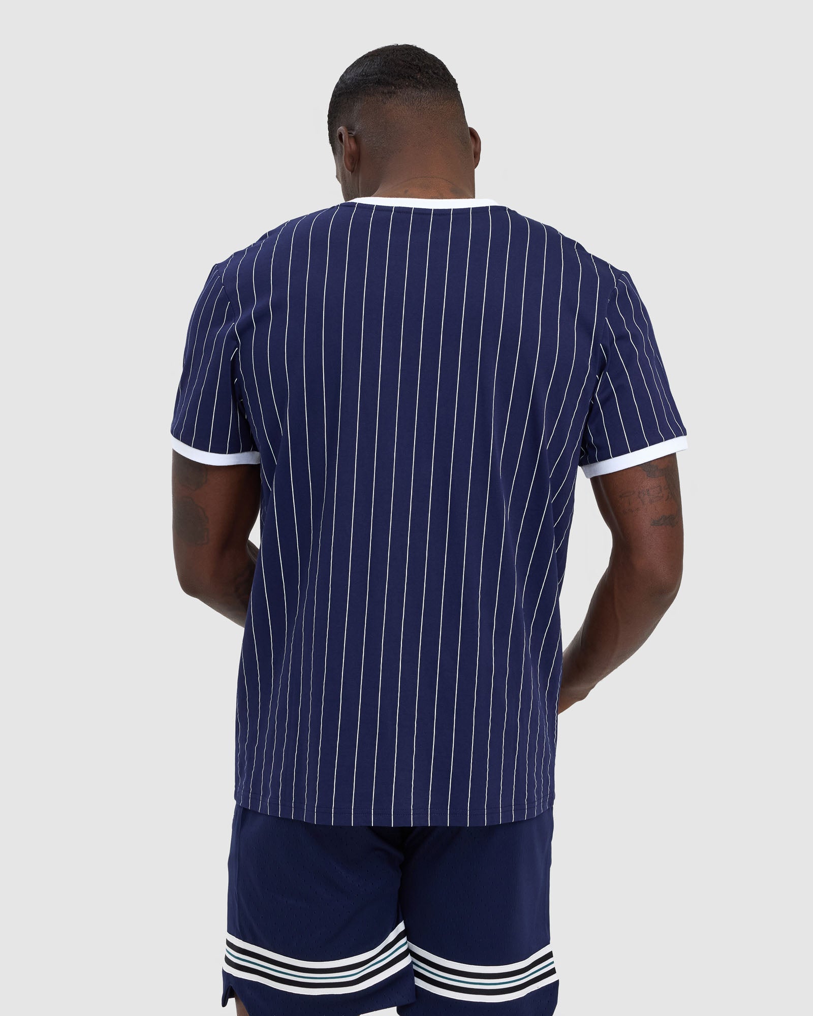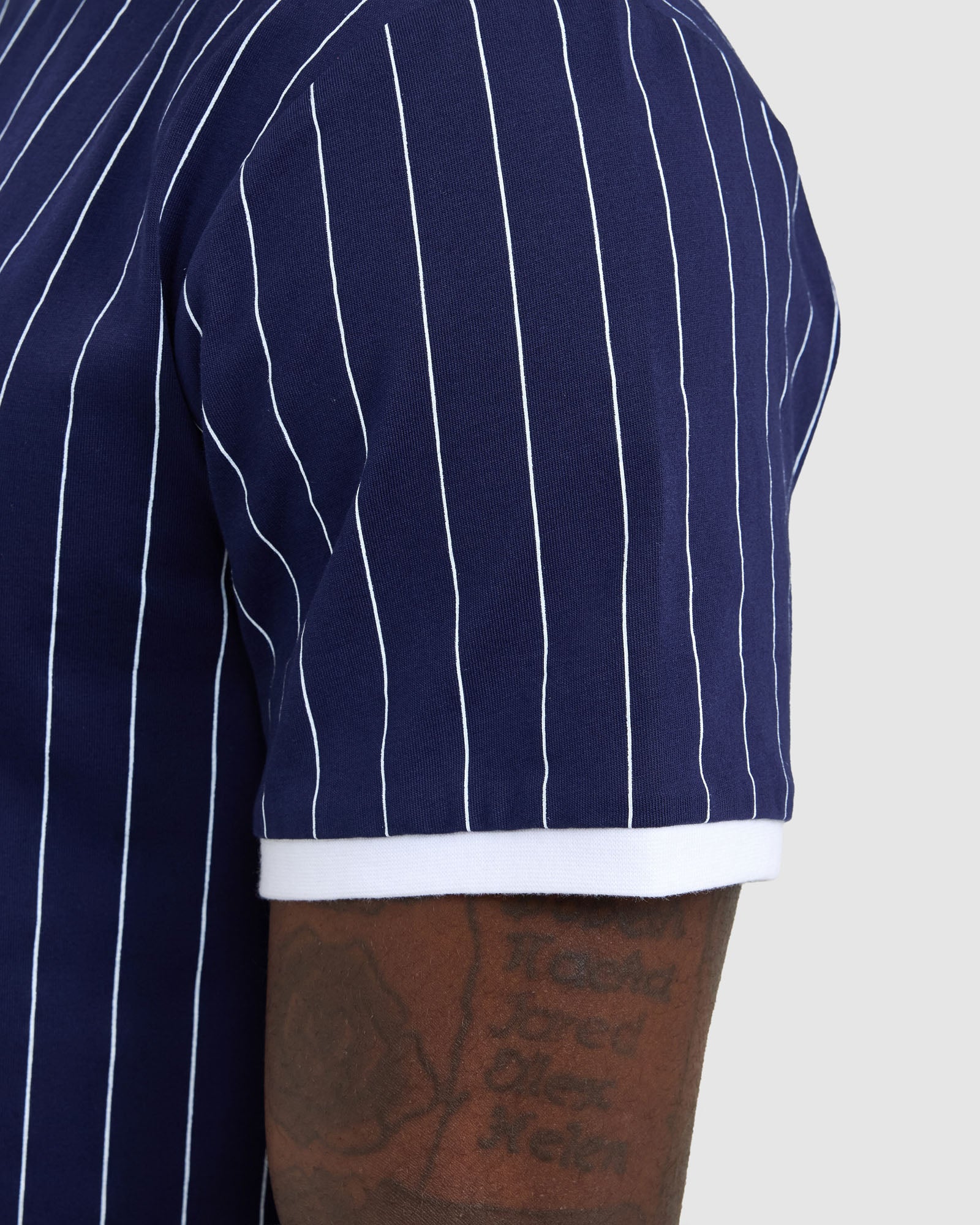 Our Men's Danilo Ringer Tee brings a fresh take on a retro style. Featuring a classic ringer neckline and sleeve cuffs, this tee is elevated with an all-over pinstripe design for a bold, vintage inspired look. Made from soft cotton fabric, it offers a comfortable, relaxed fit - perfect for everyday wear with a sporty edge.